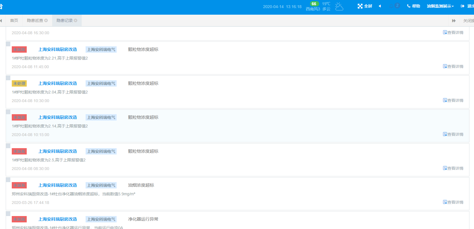 系統(tǒng)根據(jù)采集的油煙數(shù)值大小,產(chǎn)生對應(yīng)的排放超標(biāo)告警;對凈化器的運行數(shù)據(jù)分析,上傳凈化設(shè)備對應(yīng)的運行、停機、故障等告警事件。