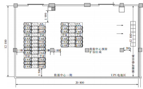 某煤礦模塊化數(shù)據(jù)中心的平面配置如圖 1 所示,某煤礦數(shù)據(jù)中心實景如圖 2 所示。 某煤礦數(shù)據(jù)中心共采購兩組 IDS 2000 雙 排模塊化數(shù)據(jù)中心,西側(cè)模塊數(shù)據(jù)中心包含一體化配電柜、行間空調(diào)、UPS 電源、雙回路電源輸入柜、UPS 電源輸出柜、空調(diào)電源柜,東側(cè)模塊數(shù)據(jù)中心包括配電柜、行間空調(diào)、中控、監(jiān)控和 ODF 配線柜,其中還在數(shù)據(jù)中心機房預(yù)留有擴容區(qū)域。