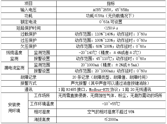 產(chǎn)品具有短路保護(hù)、過載保護(hù)、表內(nèi)超溫保護(hù)、過欠壓保護(hù)、配電線纜溫度監(jiān)測、漏電流監(jiān)測功能、通訊等功能。